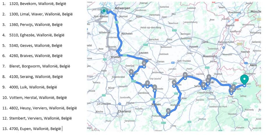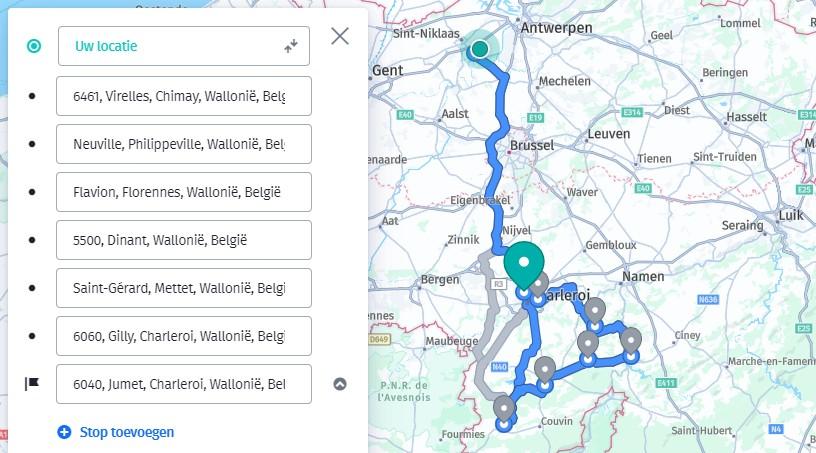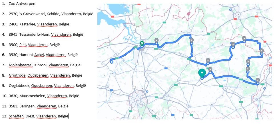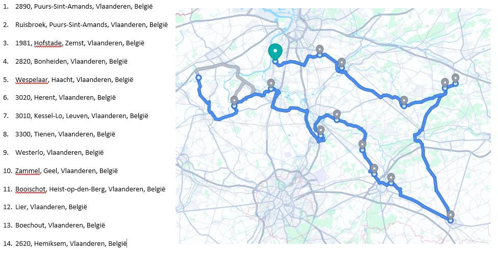 * Hoe kan u het uur van levering bij uw adres uitrekenen? U start bij Waasmunster om 9h (indien onze chauffeur op een ander tijdstip vertrekt dan zal dit bij het plannetje vermeldt worden). Dan telt u ongeveer de tijd daarbij tot de volgende stop die linksboven in de blauwe kolom vermeld staat bijvoorbeeld 'Antwerpen' dat zal ongeveer 30 a 45 minuten duren + daarbij komt ongeveer 15 minuutjes tijd om de bestelling te lossen. Momenteel zit u al aan 9h15 + 30 minuten + 15 minuten = 10h. Vervolgens telt u de tijd tot het volgende adres er bij en daar ook weer 15 minuutjes om de bestelling te lossen enzovoort. * Wij maken de routes via Google Maps waar slechts 10 gemeentes per keer kunnen op gezet worden. Indien onze chauffeur meerdere gemeentes dient aan te leveren, typen we die er manueel onder.