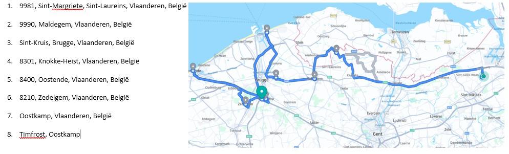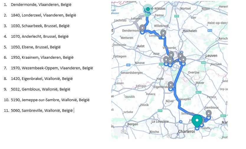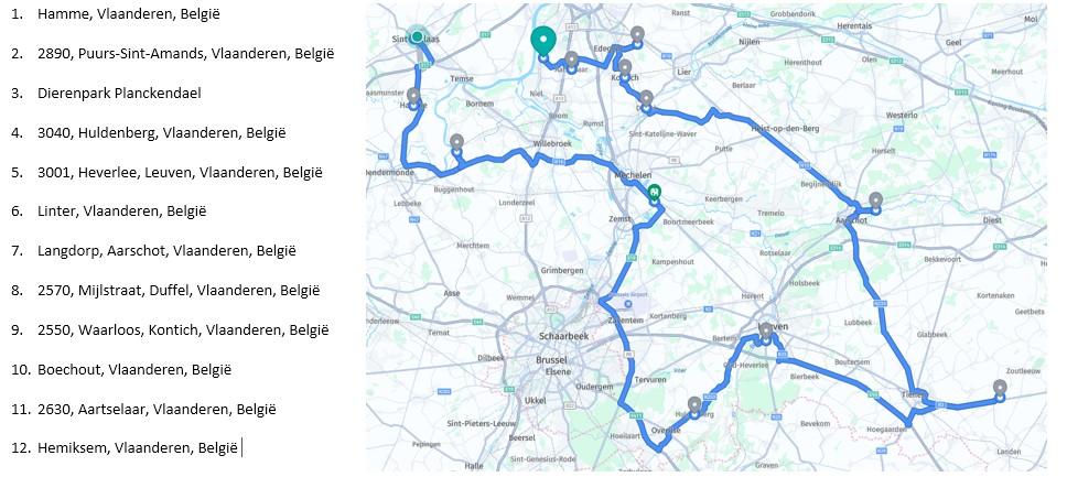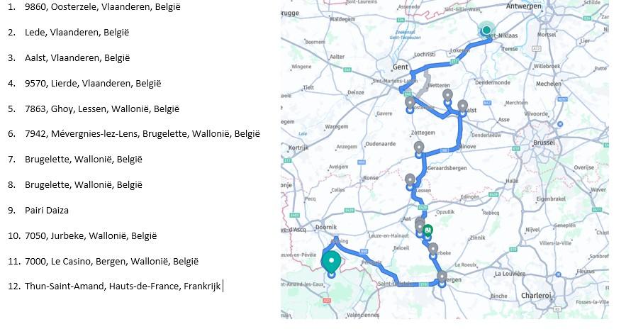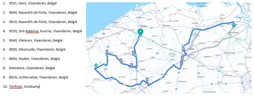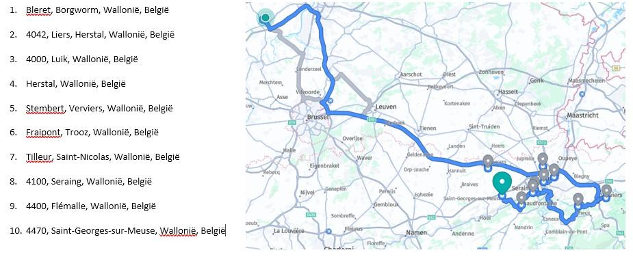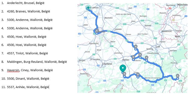 * Comment pouvez-vous calculer le délai de livraison à votre adresse ? Vous commencez à Waasmunster 9h (si notre chauffeur départ plus tard ou plus tôt nous allons le noter). Ensuite, vous comptez approximativement le temps jusqu'au prochain arrêt mentionné en haut à gauche dans la colonne bleue, par exemple "Antwerpen", qui prendra environ 30 à 45 minutes + environ 15 minutes pour décharger la commande. Pour l'instant, vous êtes déjà à 9h15 + 30 minutes + 15 minutes = 10h. Ensuite, vous comptez le temps jusqu'à la prochaine adresse et là encore 15 minutes pour décharger la commande et ainsi de suite.